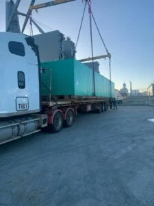 Their team organized three flatbed semi-trucks, including one with an extendable trailer, and secured Oversized Road Permits for WA. For unloading, they scheduled two 25-ton Franna cranes.
