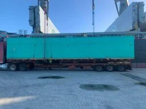 On the day or arrival into port, the pilot vehicle and trucks arrived for underhook loading, but two crates were tightly pressed together, preventing the vessel’s cranes from lifting them. A 14-ton forklift failed to separate the crates, and sourcing a second forklift with enough weight capacity proved difficult however their fantastic team at ATOS managed to pull a rabbit out of the hat.