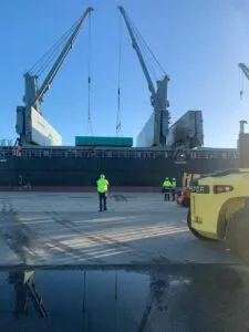 Given the size of the shipment the ATOS project team had to liaise many weeks in advance with the port, crane operators and transport to ensure smooth pick up of the crates. As they were collecting under hook of the vessel we had a very limited time frame with a lot of moving parts involved.