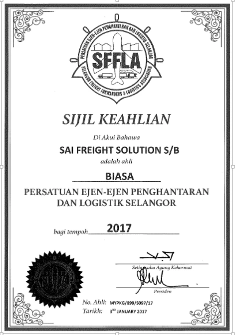 SAI Freight Solution SDN BHD joins the Selangor Freight Forwarders & Logistics Association (SFFLA) as an ordinary member